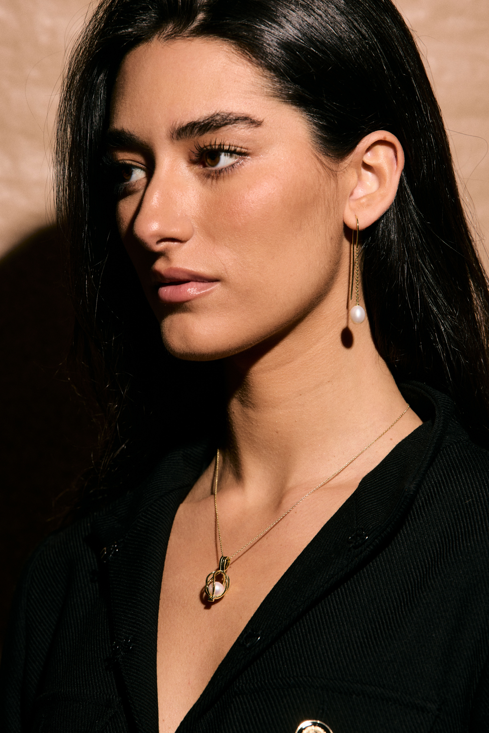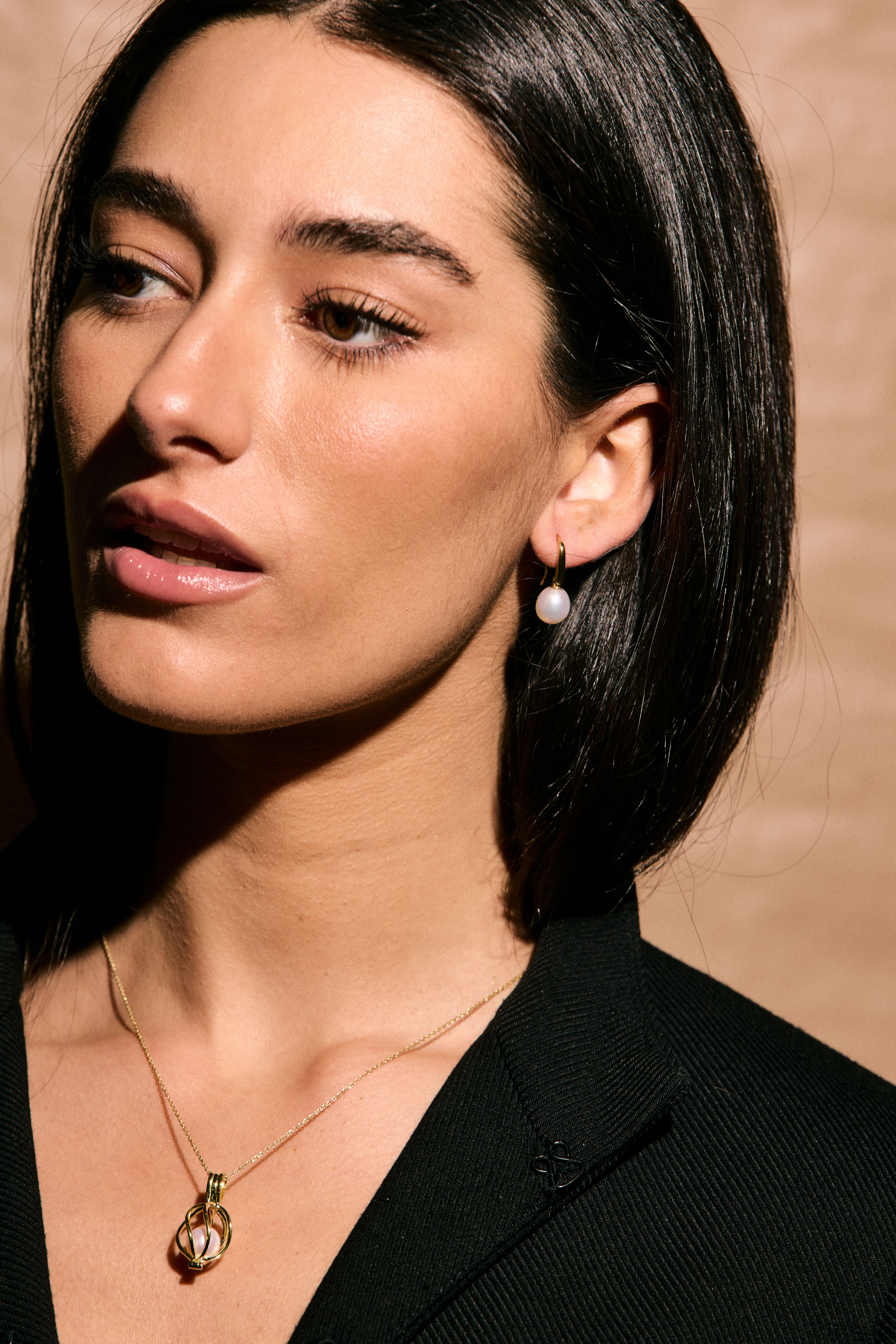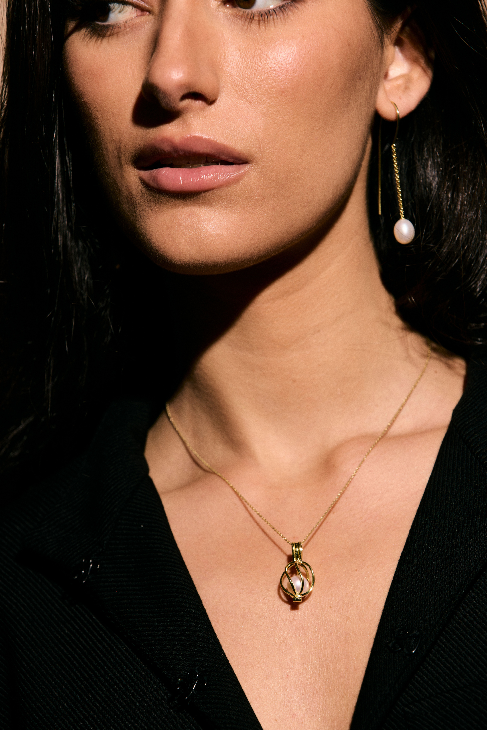Colgante en plata de ley 925 chapado en oro de 18k con perla redonda cultivada en agua dulce de 9 mm. Este colgante se puede usar con o sin perla gracias a su sistema para abrir o cerrar la jaula.