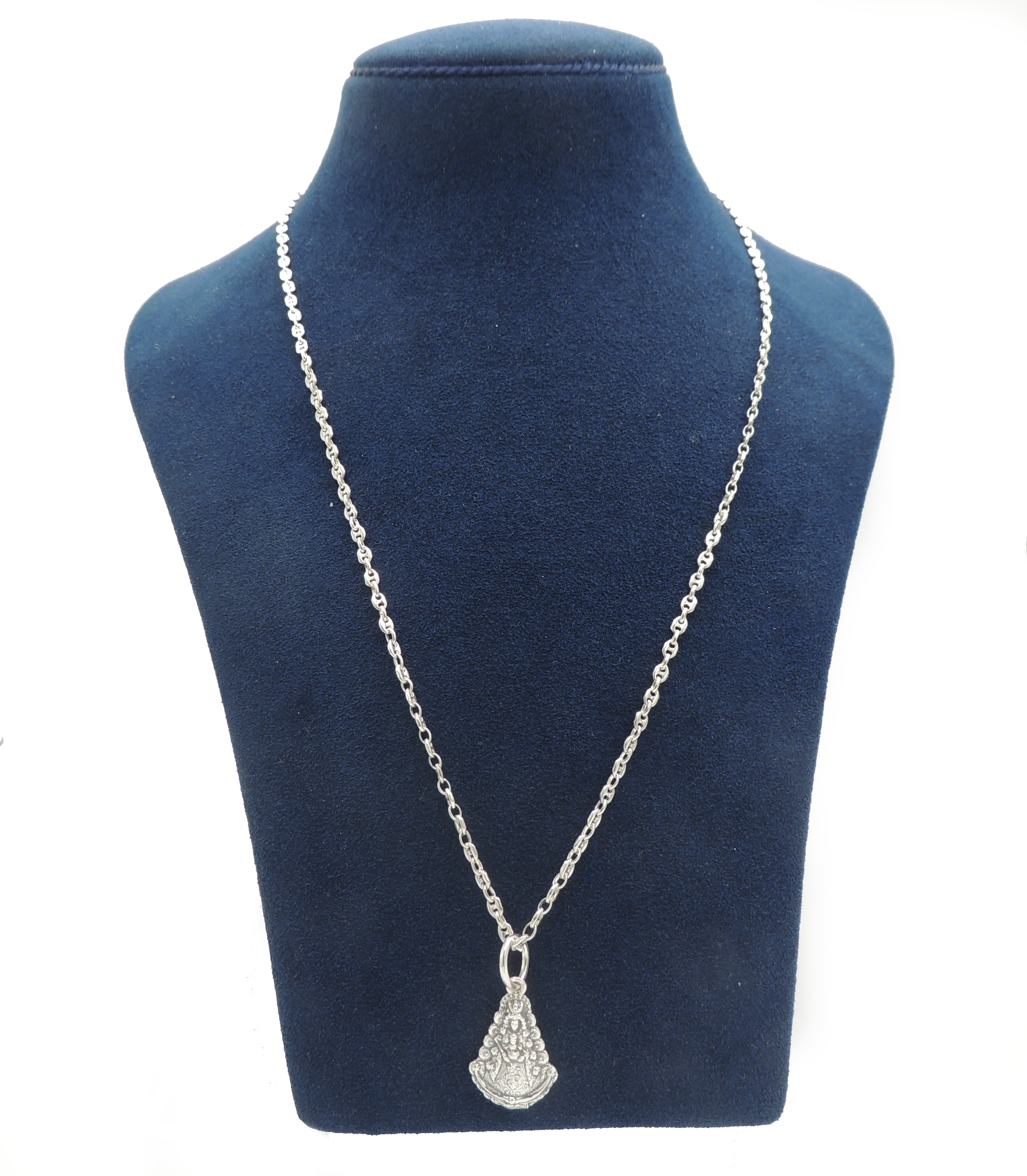 Cadena de calabrote fina en plata de ley 925 con medalla de la Virgen del Rocio en plata de ley 925, ambas cosas con un peso aproximado en su conjunto de 13 gramos. El calabrote es característico por su similitud al nudo de los barcos.
