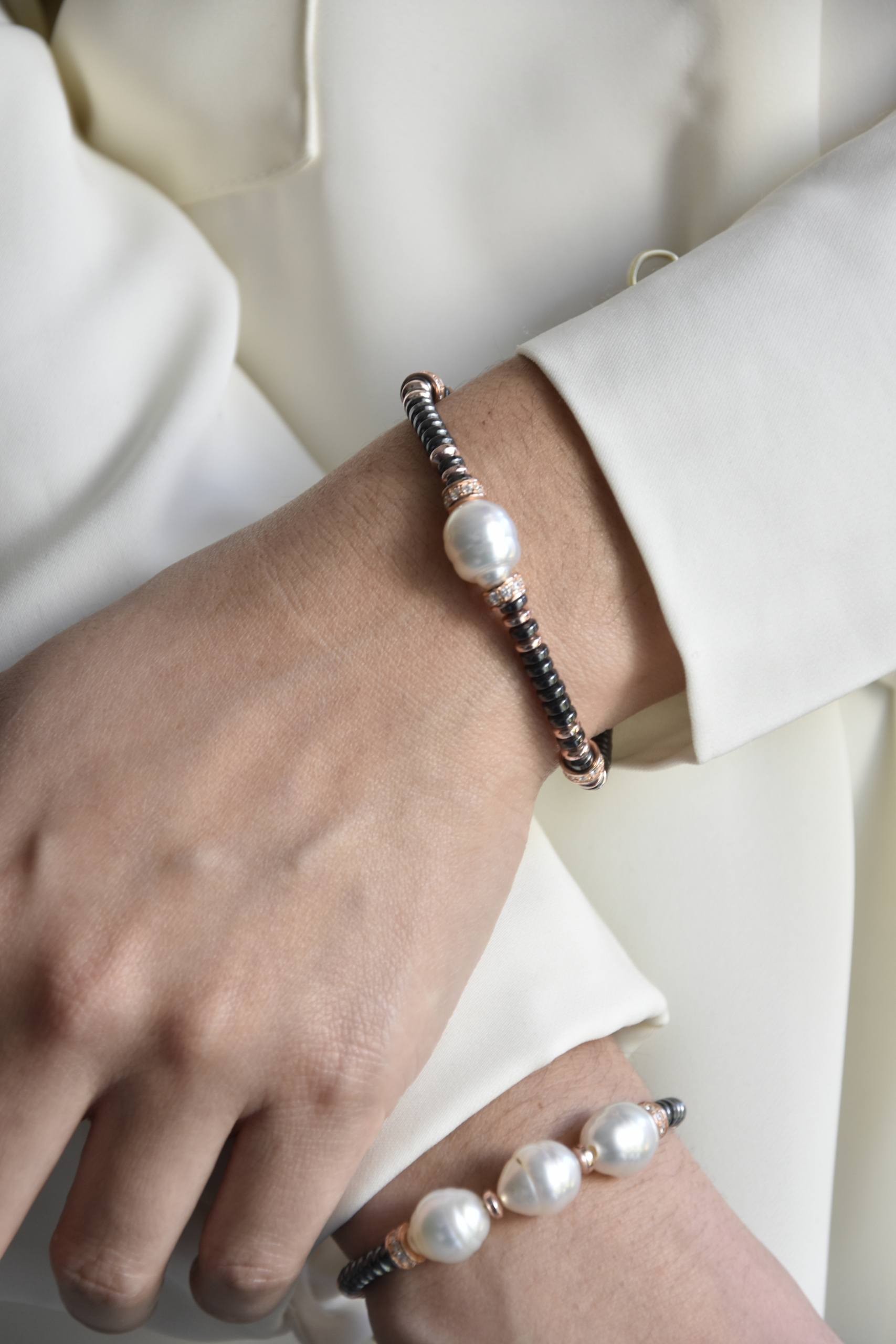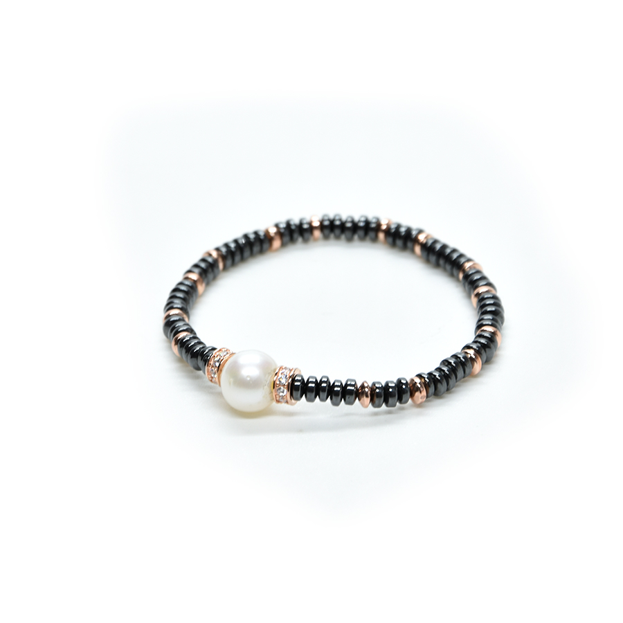 Pulsera hecha a mano con hilo elastico, formada por hematites negros y rosas y 2 entre piezas de plata y circonitas de color rosa, con perla cultivada en agua dulce de forma semi redonda de 10 mm de tamaño