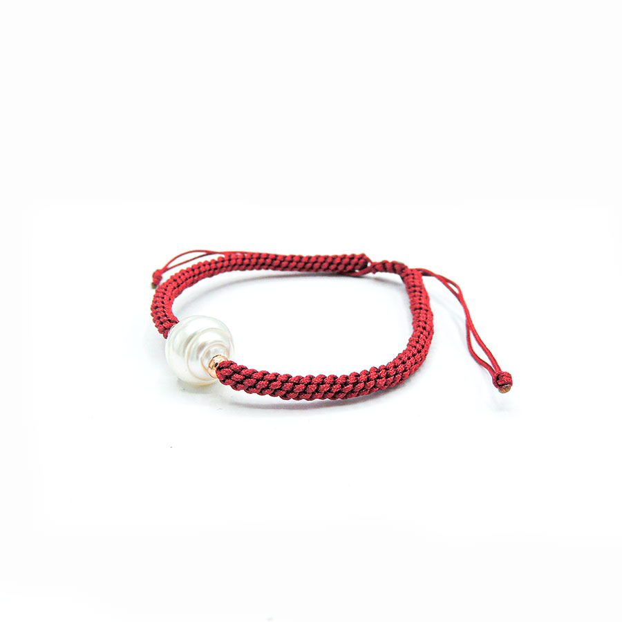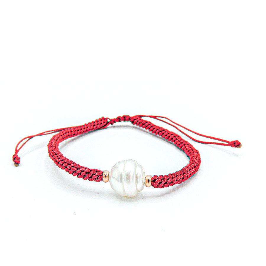 Pulsera hecha a mano con hilo de macramé en distintos colores, entre piezas de oro de 18k en ambos lados y perla australiana de forma circular de 9 mm de tamaño.