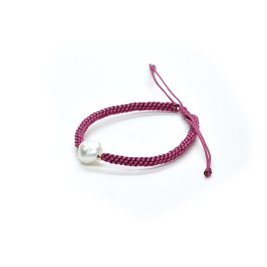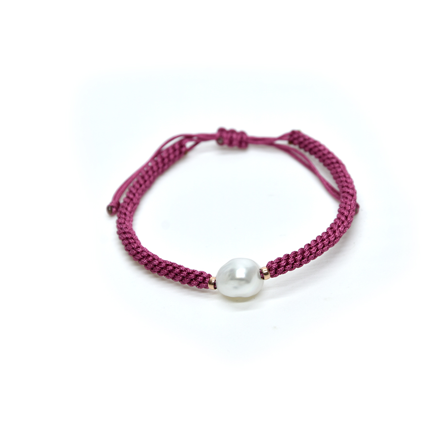 Pulsera hecha a mano con hilo de macramé en distintos colores, entre piezas de plata de ley 925en ambos lados y perla keshi de 9 mm.