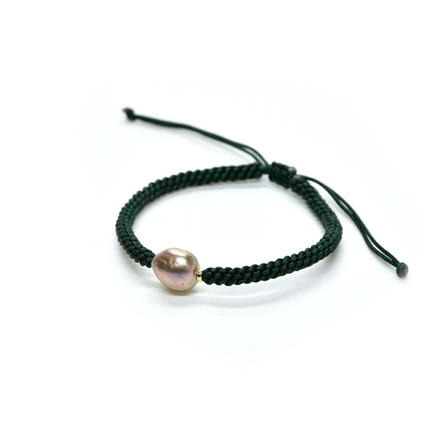 Pulsera macramé verde botella con entre piezas de oro de 18k y perla cultivada redondo color rosa de 9 mm