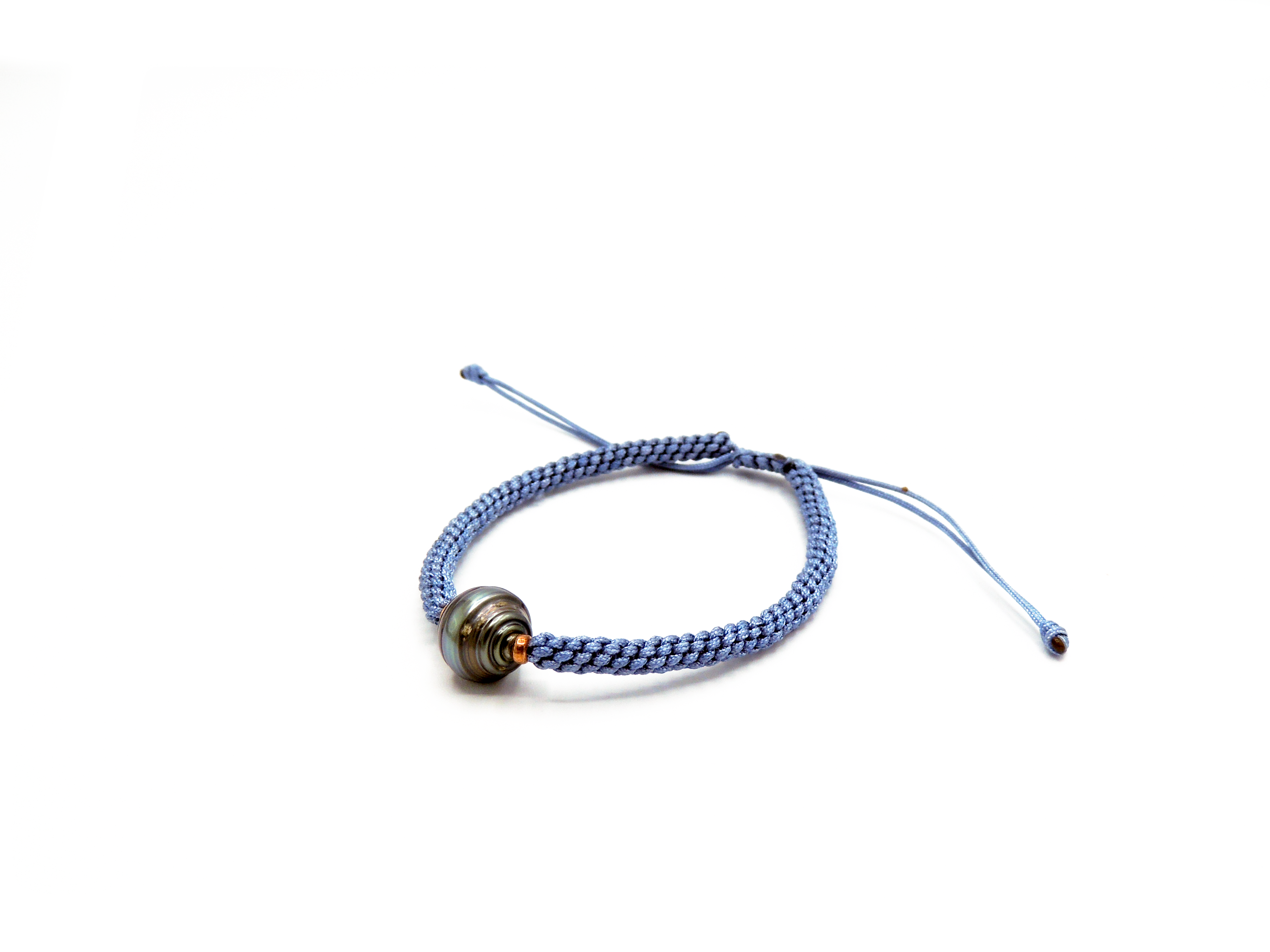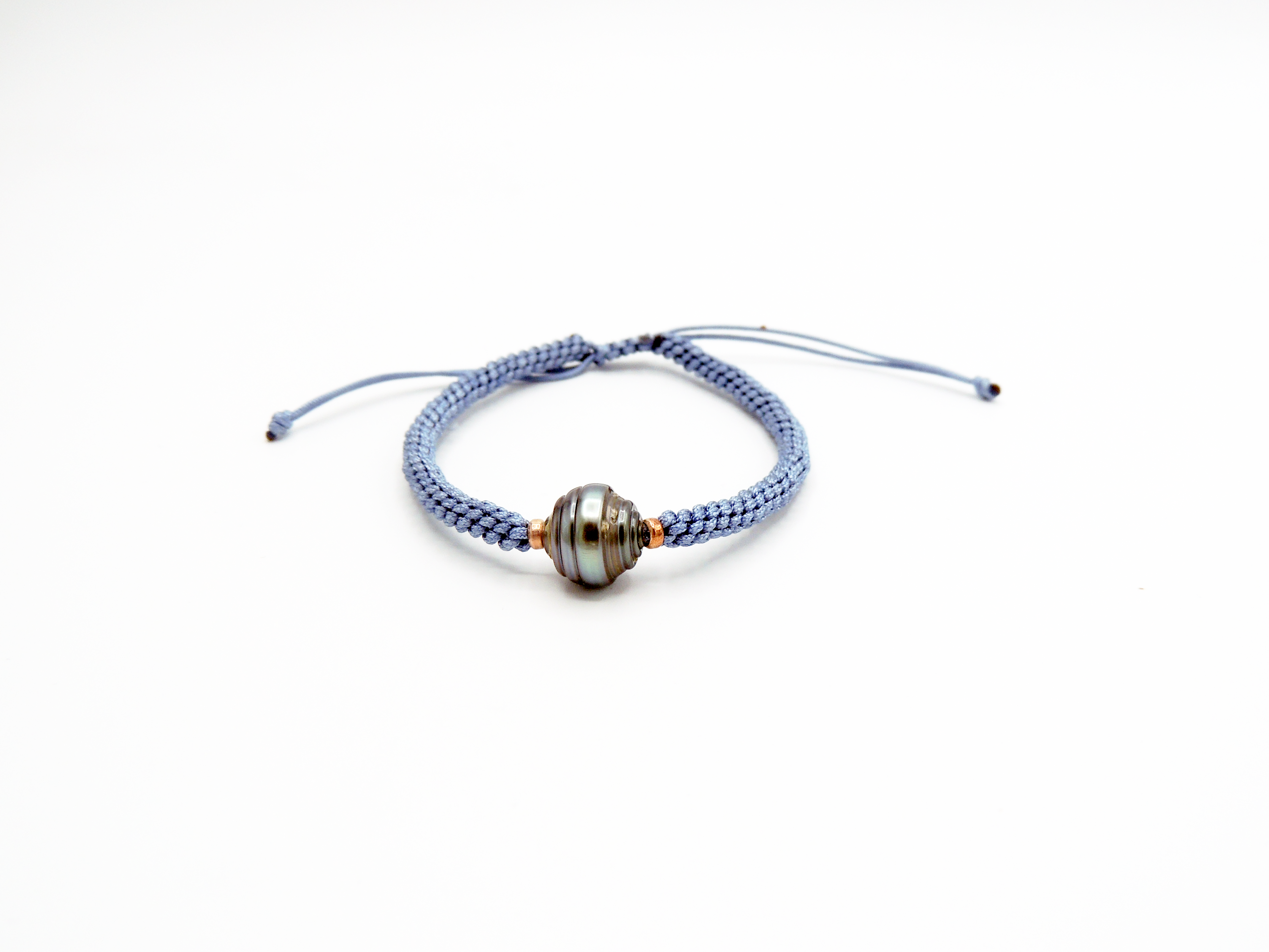 Pulsera macrame azul con entrepiezas de plata de ley 925 con un baño de oro rosa y perla Tahiti de 10 mm.