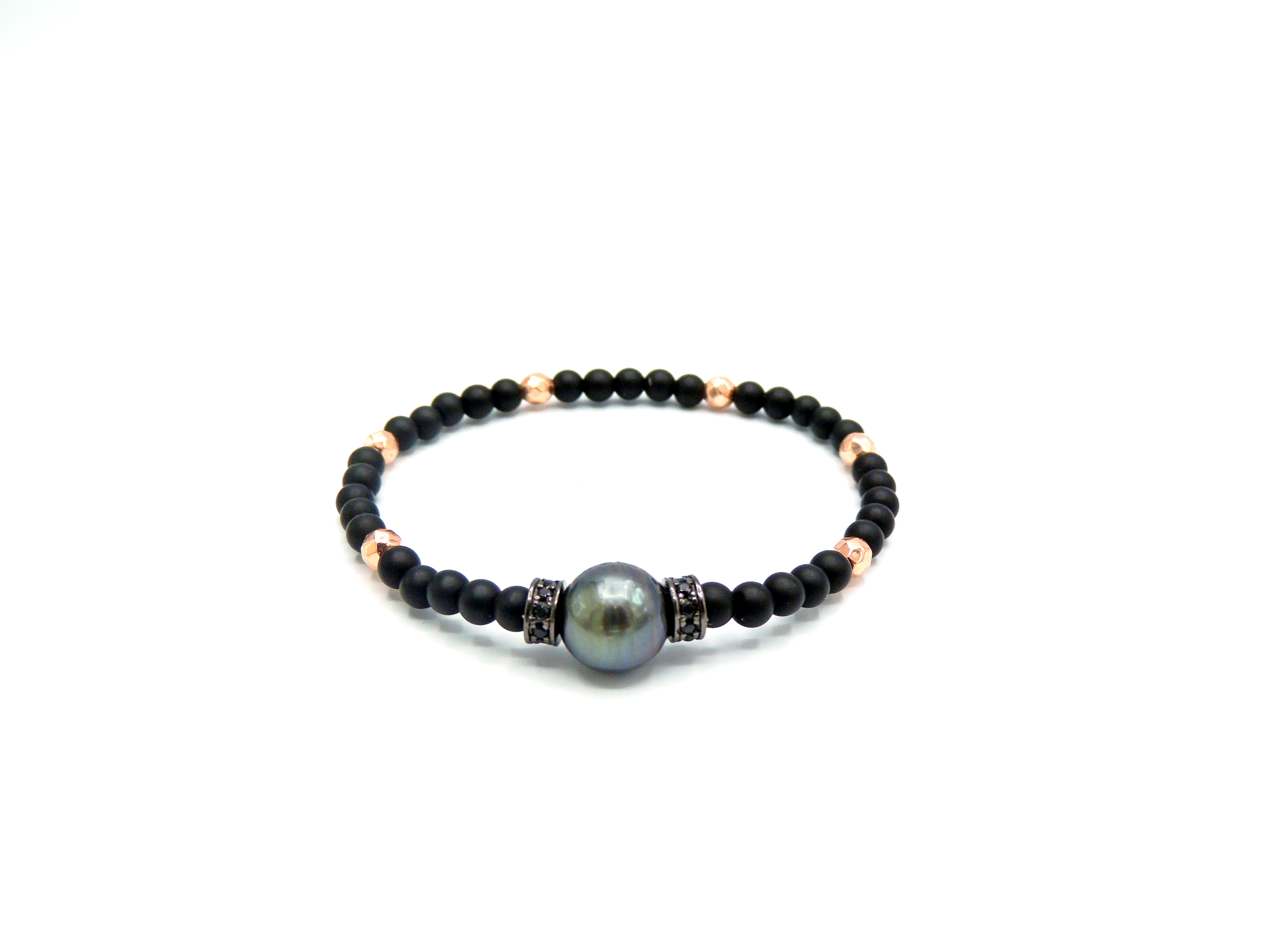 Pulsera hecha a mano con cordón de silicona elástico y compuesta por piedras de Ónix negro, 6 hematites redondos de color rosa. 2 entre piezas de plata y circonitas de color negro con perla cultivada en Tahití de forma redonda de 10 mm.
