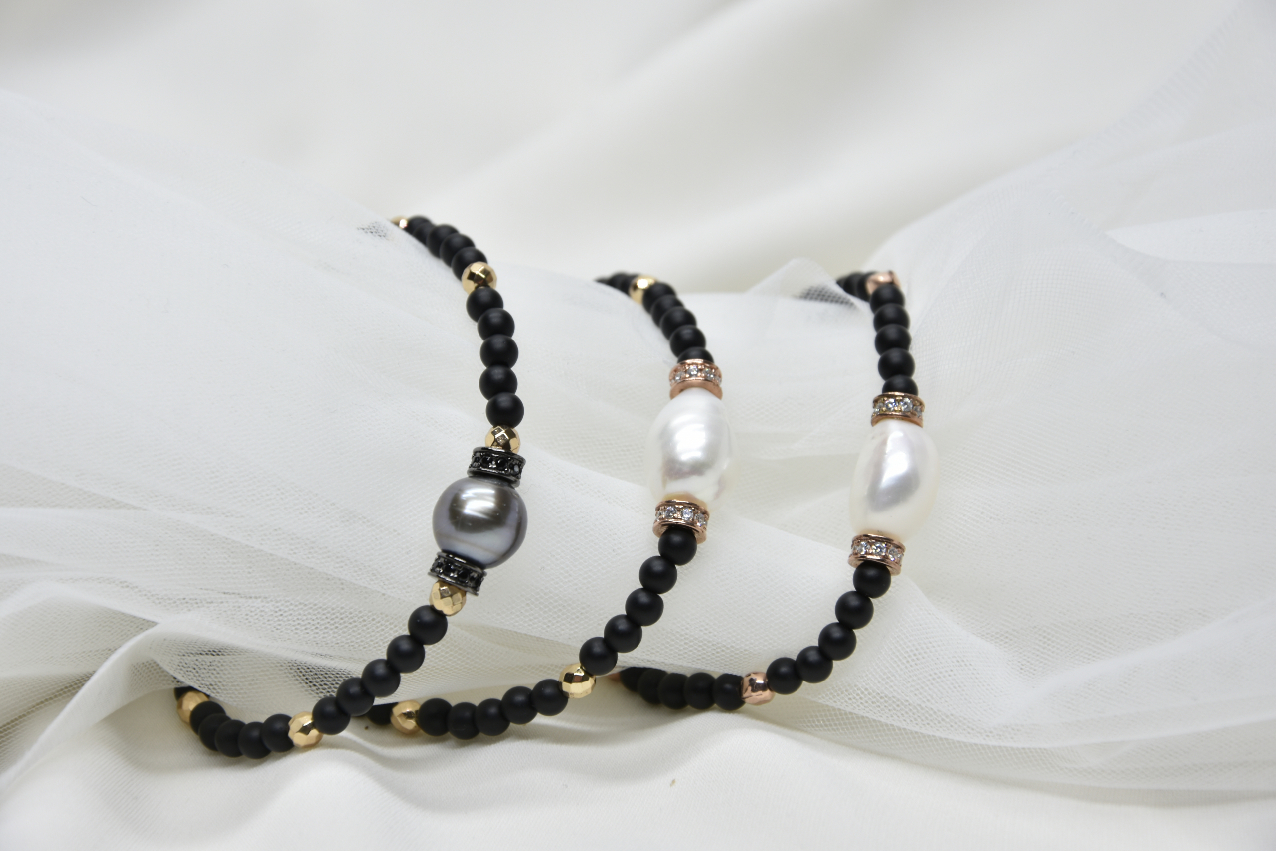 Pulsera de Ónix con hematites color rosa, entre piezas de plata y circonitas color negro y perla Tahití redonda de 10 mm.